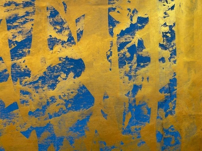 Dit prachtige werk van Reinhard Sommer is een prachtig canvas, met de sprekende kleuren goud en blauw. Bij daglicht is het bijzonder mooi hoe het goedpigment naar voren komt. Het doek meet 215 x 150 cm en wordt aangeboden zonder lijst. Het betreft een origineel kunstwerk dat door de kunstenaar is gesigneerd.