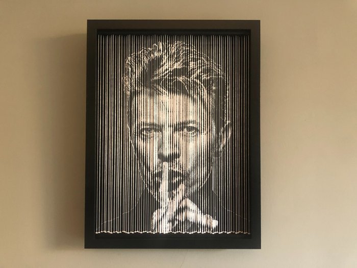 Gesigneerde 3-dimensionale anamorfe draadsculptuur van David Bowie. De variabele dikte van de 72 individuele (zuiver witte) draden zorgt voor het beeld. Hoewel het beeld is gemaakt van ingewikkelde vormen, is het stuk een solide constructie.