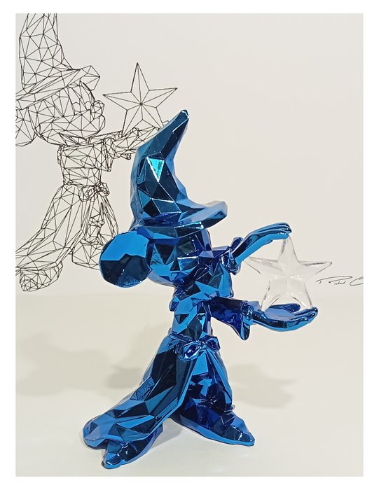 Prachtig zeldzaam beeld van Mickey's Sorcerer's Apprentice opnieuw bezocht door Richard Orlinski in de kleur blauwchroom met een transparante ster.