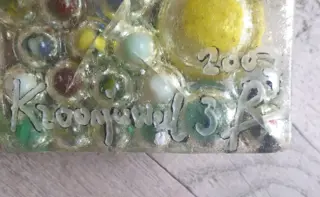 Een Kroonjuweel uit 2007 van Rob Scholte. Het ging Scholte om het ruilmiddel de knikker. Hij zag het als geld met een waarde. Vandaar de term Kroonjuweel. In het jaar 2007 heeft Jaski in het Spiegelkwartier een grote tentoonstelling met deze werken gehad. Alle Kroonjuwelen hebben een nummer. Het gaat hier om nummer 3. Op de achterzijde gedateerd, gesigneerd en genummerd. Formaat is 10 x 10 x 4 cm. Er zijn wat barstjes te zien aan de achterzijde, maar die zijn niet door en door of schadelijk voor het werk.