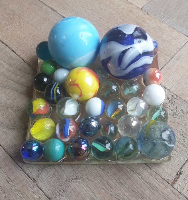 Een Kroonjuweel uit 2007 van Rob Scholte. Het ging Scholte om het ruilmiddel de knikker. Hij zag het als geld met een waarde. Vandaar de term Kroonjuweel. In het jaar 2007 heeft Jaski in het Spiegelkwartier een grote tentoonstelling met deze werken gehad. Alle Kroonjuwelen hebben een nummer. Het gaat hier om nummer 53. Op de achterzijde gedateerd, gesigneerd en genummerd. Formaat is 10 x 10 x 4 cm.