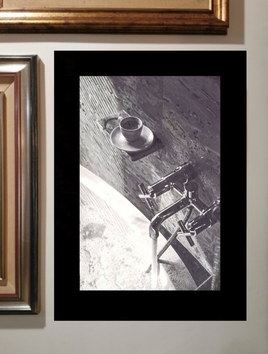 De tafel, met de hand gladgestreken en zwart geverfd door de kunstenaar, geeft elegantie aan het kunstwerk, waardoor het een uniek handgemaakt object is als geheel.