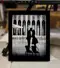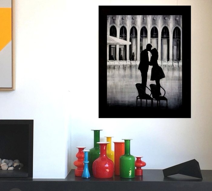Het bord, met de hand geschuurd en zwart geverfd door de kunstenaar, geeft elegantie aan het kunstwerk, waardoor het als geheel een uniek handgemaakt object wordt.