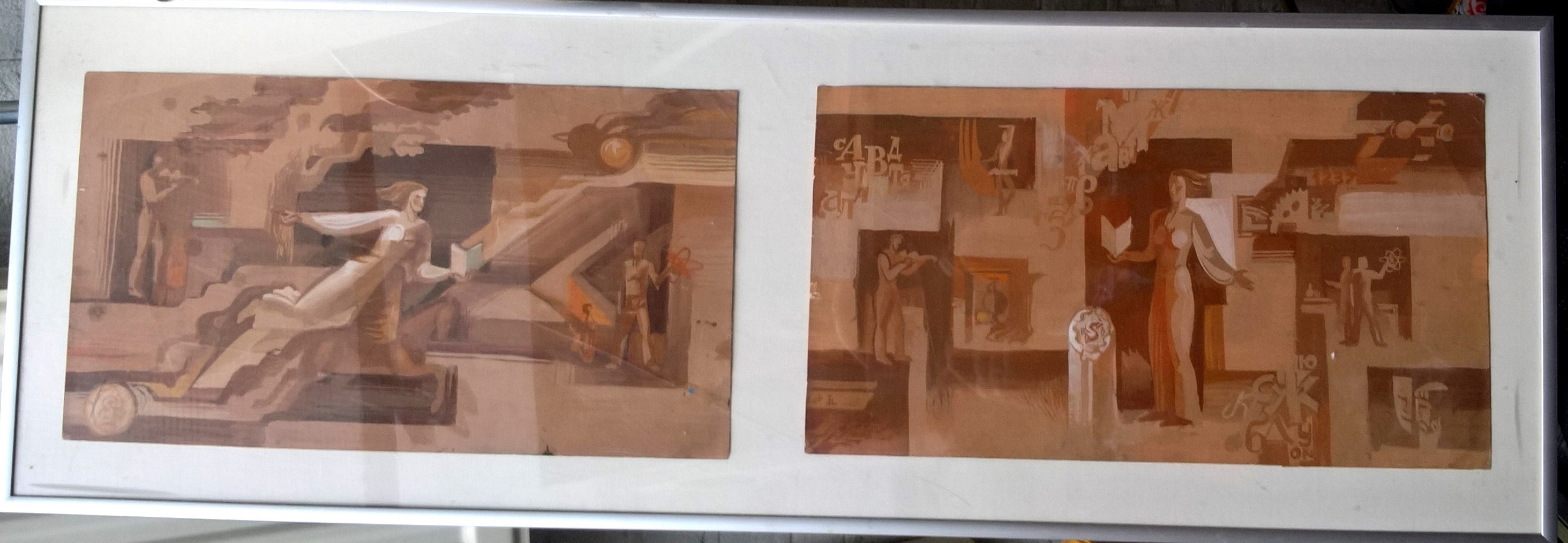 Russisch propaganda wetenschap 2x gouaches 20 x 40 cm met lijst 92 x 32 cm