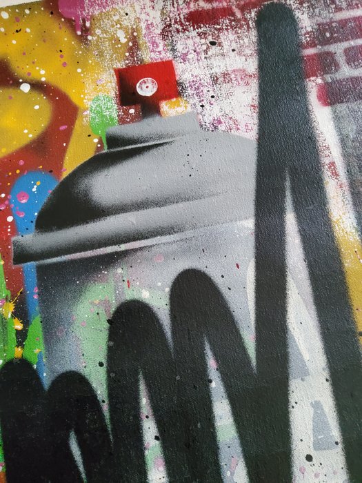 Dit originele exemplaar is met de hand gemaakt met spuitverf. Gepresenteerd op linnen canvas meet dit kunstwerk 70cm x 70cm. Het canvas heeft een rand van 5 cm rond alle vier de zijden om inlijsten/uitrekken mogelijk te maken. Gesigneerd en gedateerd door de kunstenaar op de achterzijde.