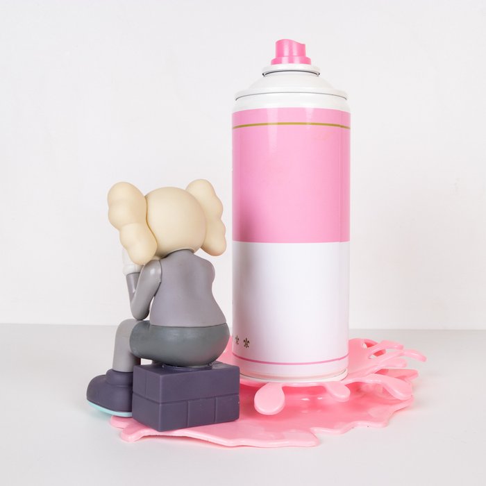 - Beschrijving: Workshop Direct! Spray Campbell's Kaws Soup-sculptuur op een roze SPLASH-basis, gemonteerd op een beroemde Kaws-metgezel die er doorheen gaat, het Kaws-beeldje maakt deel uit van het werk.