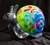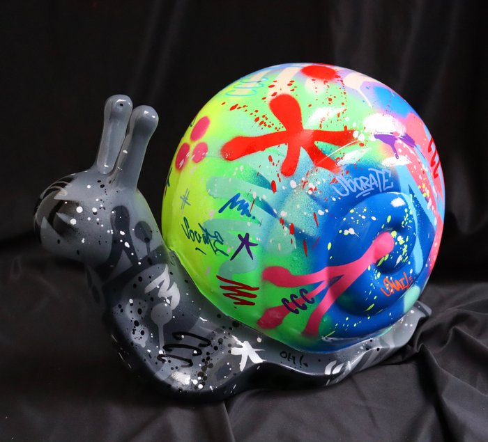 Acryl op grote neon en zwarte en grijze slakkensculptuur in hars met carrosserievernisafwerking.