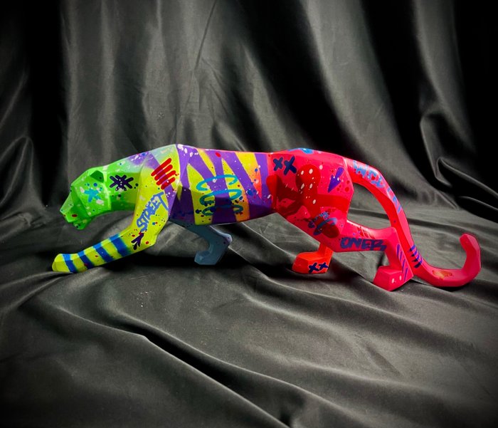 Acryl op panterbeeldhouwwerk in hars met carrosserievernisafwerking.