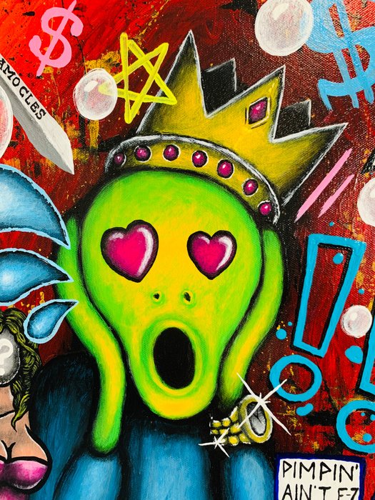 Het personage uit Munch' beroemde schilderij 'De Schreeuw' wordt hier afgebeeld, bezwijkend onder het gewicht van zijn eigen (verlangen naar) succes.