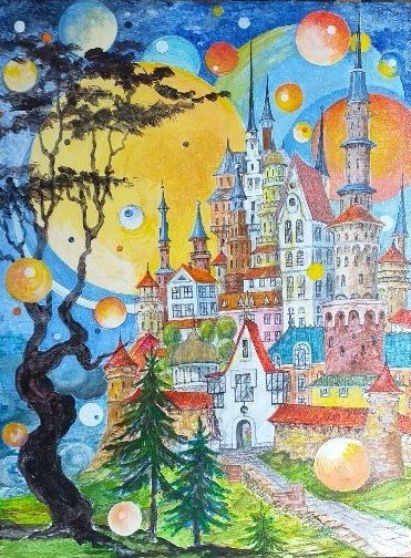 Een van mijn laatste schilderij, acryl op hardbord, 30 x 40 cm. Soms wil ik weg van de realiteit gaan en droom ik over mooi kleurige vesting erg ver ergens in de vergetend bos…