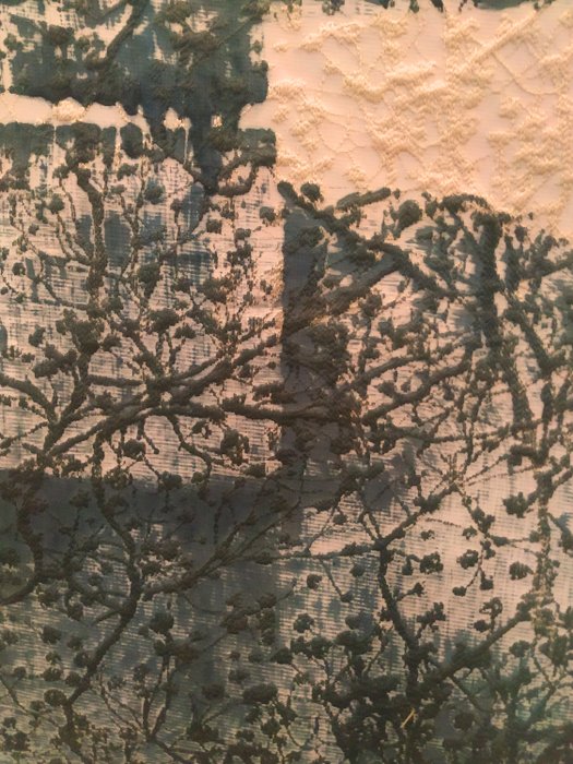 Dit werk is als een oosters geïnspireerde kalligrafie van de ineengestrengelde tulpenbloemen met een brede borstel op een geborduurde textielachtergrond. Geïnspireerd door Japanse kakejiku om het te plaatsen. Ook met een lijst en plaats deze op.