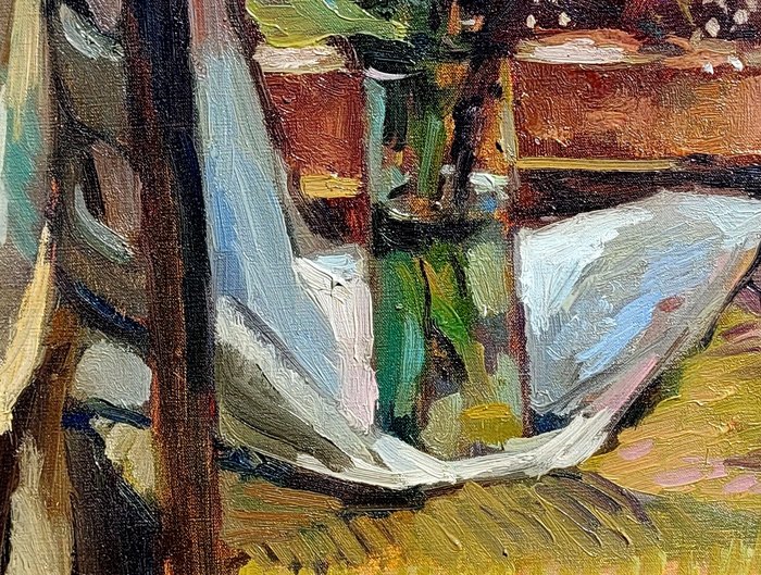 Prachtig stilleven schilderij van de Nederlandse kunstenaar Toon Klaver, geboren 1933 te Hengevelde. De foto is aan de achterzijde met potlood gesigneerd "Toon Klaver 1987". Klaver is een hedendaagse impressionistische schilder die werkt en exposeert in Lochem (Gelderland).