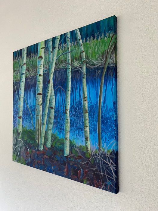 This painting I made of birchtrees we came across at Eernewoude Holland. I thought the combination of the trees in the front and trees in the back and in the reflection was beautiful.