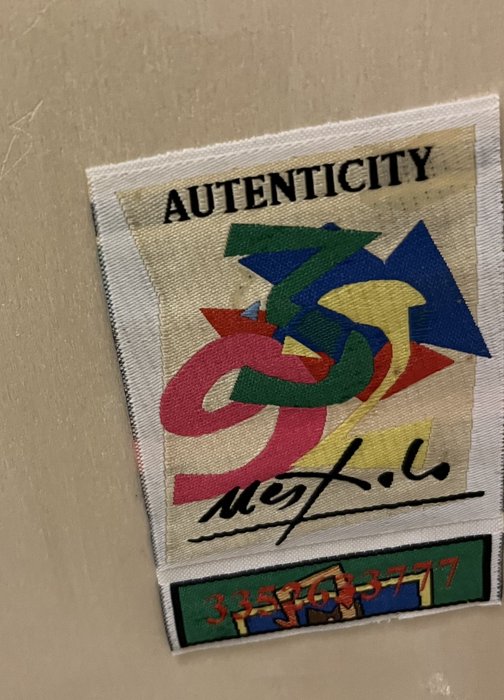 Werk in acryltechniek op ingelegd hout van meester Nespolo, in perfecte staat, met relatieve authenticatie op foto en houten lijst.
