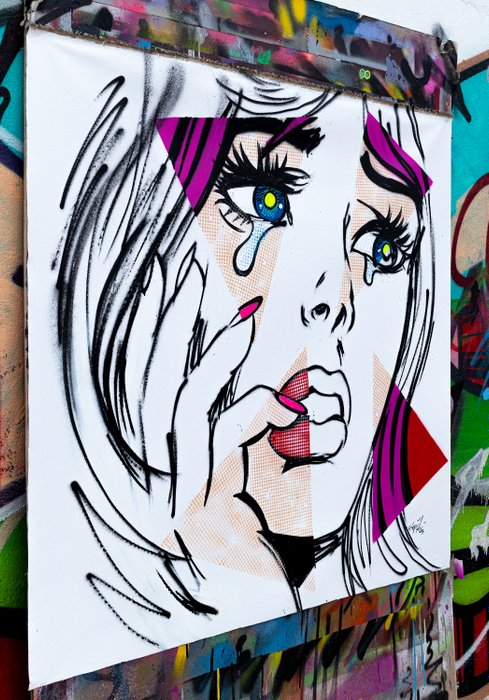 - Origineel graffiti-kunstwerk gemaakt met spuitbussen, mixed media en een geheim element op katoen.