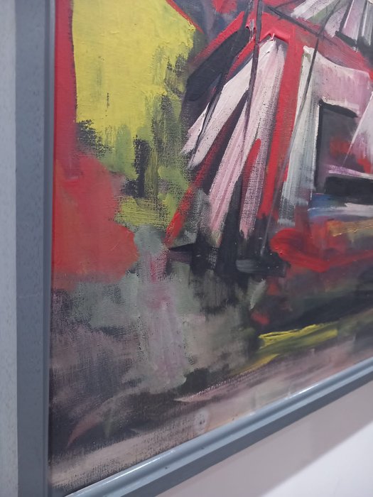 Olieverf op doek van Vittorio Postiglione "The Circus", 1964 gesigneerd door de kunstenaar op de voorkant. De afmetingen zijn 102x73cm. Met de lijst is het canvas alleen al 100x70.