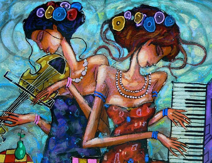 Acryl/oliepastels schilderij op canvas, opgespannen op een professioneel schildersweefgetouw.