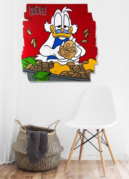 Een zeldzaam stuk van WO$H op pallets van teruggewonnen hout. Een stuk van groot formaat. Schilderij van PICSOU in zijn gouden bad (Picsou, Scrooge, Mickey, Disney, Comics, Marvel). Een multitechnisch werk, afgewerkt met een glanzende anti-UV lak. Een zwaar en degelijk werk, klaar om tentoongesteld te worden.