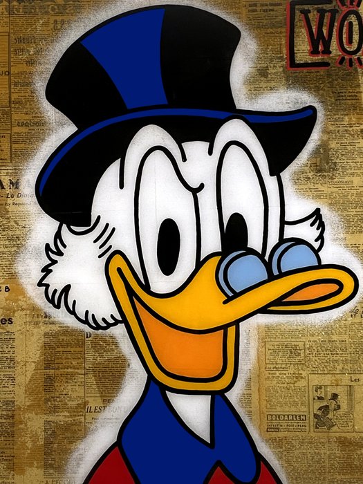 Schilderij van Dagobert (Picsou, Dagobert, Mickey, Disney, Comics, Marvel) op een houten frame bedekt met een basis van oude kranten. Een multitechnisch werk, afgewerkt met een verglazing van epoxyhars. Een zwaar en degelijk werk, klaar om tentoongesteld te worden.