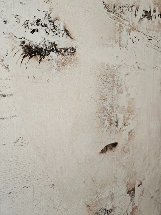 Modern, figuratief-abstract mixed media kunstwerk. Opgebouwd uit verschillende lagen, dekkend en transparant en met diverse materialen.