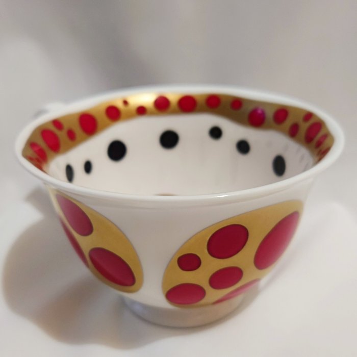 Yayoi Kusama Art Edition "My Favorite Me" "The Me That I adore" Ze tekent rechtstreeks op puur witte kopjes en schotels, zijn getrouw gereproduceerd. Prachtige gouden vaten met veel goud zijn Yayoi Kusama's kunstgoederen als geen ander. Nikko Co., Ltd., een keramisch merk in Ishikawa, Japan. Dat bestaat al zo'n 100 jaar, heeft het met behulp van geavanceerde technologie over de details vervaardigd. Er zijn 500 stuks theeservies vervaardigd en genummerd van 001 tot 500. dit is nummer 333.