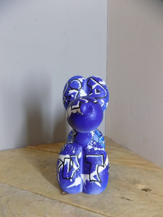 Het schilderij is gemaakt op een hond in de vorm van een opblaasbare ballon, in hars.