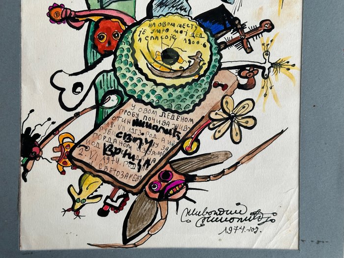 Origineel aquarel schilderij van beroemde Servische naïeve kunstschilder - Zivotin Nikolic.