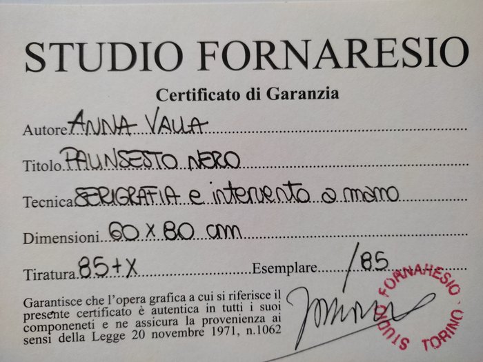 Certificaat van echtheid en reliëfstempel van Studio Fornaresio.