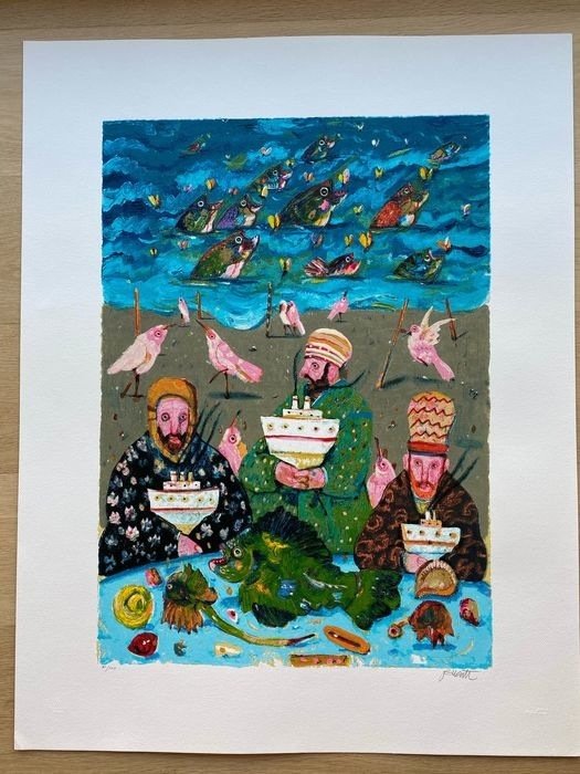 Zeefdrukwerk van Antonio Possenti gepubliceerd in 1998 door de Galleria Arte Pentagono, getiteld "De drie zeelieden", professionele verzending over de hele wereld.