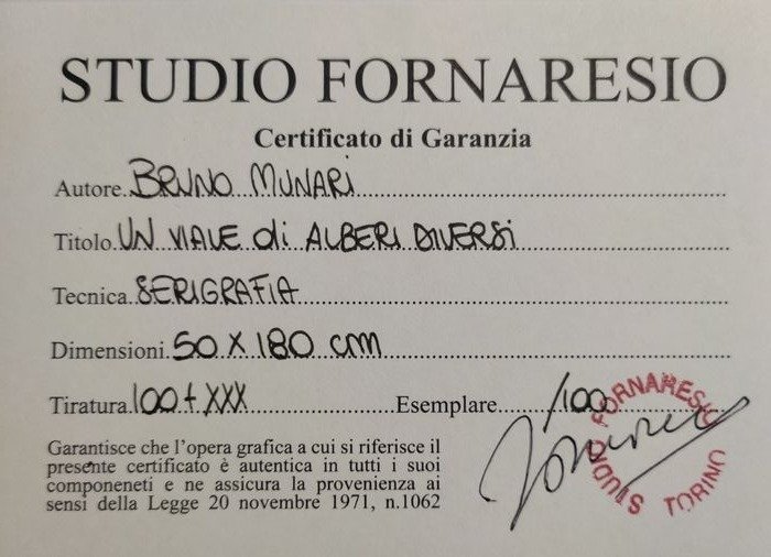 Certificaat van echtheid en reliëfstempel van Studio Fornaresio.