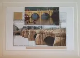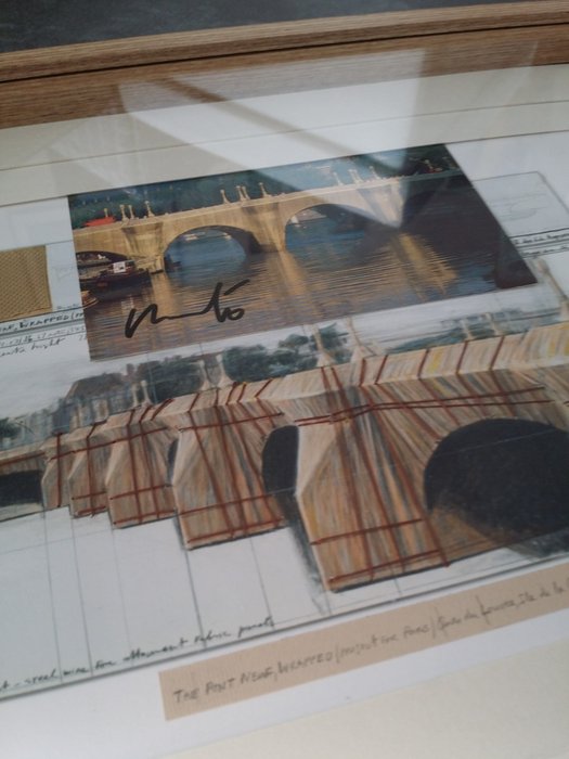 Ar Kaart van de installatie, van een panoramisch zicht op de volgepakte Pont Neuf in Parijs in 1985. Handgesigneerd door Christo in 1993. Handtekening met de eigen stijl die wordt gebruikt in het grafische werk van de jaren '60 en '70. Perfect.