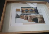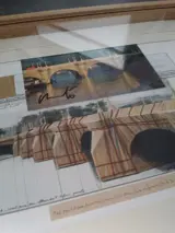 Op de achtergrondtekening is een royaal stuk stof van de installatie toegevoegd. Het papier is ook genaaid met bruine draad die het wikkelen van de beroemde Parijse brug simuleert. Montage gemaakt door leraren Schone Kunsten in Madrid.