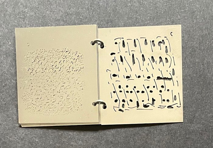 Prachtige boekachtige multiple van 5 geperforeerde staalplaten, elk met een bepaald ontwerp, in een plexiglas kast, exemplaar 71 van 500