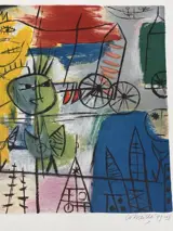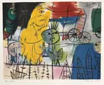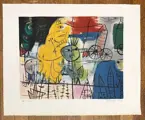 Grote originele lithografie naar een schilderij van Cobra uit 1949. La Rue vertolkt het menselijk leven in een kinderachtige tekening, en de drukte van de stad in een vrolijke en stralende explosie van kleuren. Wat hieruit naar voren komt, is wat Michel Ragon "An abstract landscaping" noemde.