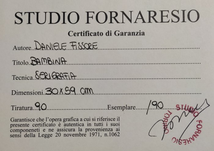 Certificaat van echtheid en reliëfstempel van Studio Fornaresio.