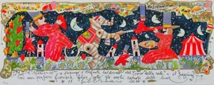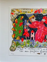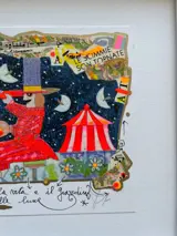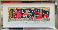 Zeefdruk met meerdere materialen van meester Francesco Musante. Totale afmeting met lijst: 64 x 34 cm.