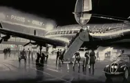 We zien de luchthaven Orly te Parijs, een vliegtuig en mensen.