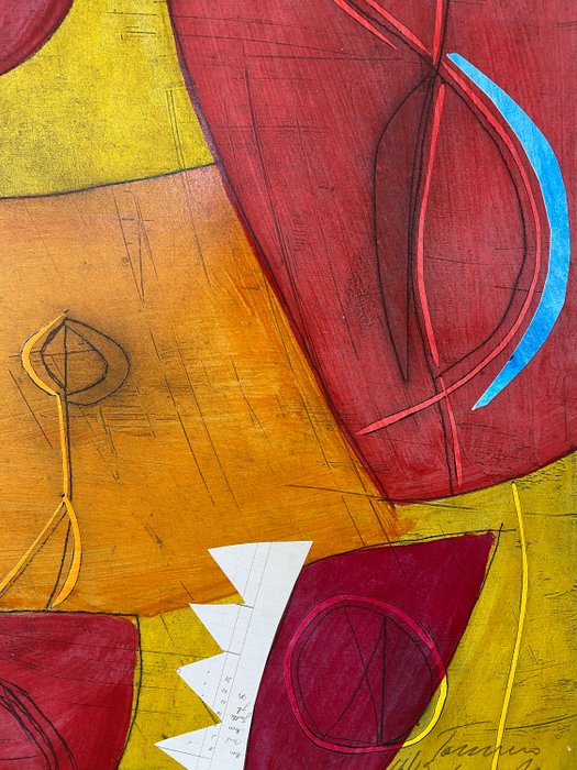 Het werk is een intensieve chromatische compositie van de kunstenaar en vormt een echte architectuur, bezaaid met symbolen, bijna een alchemistisch alfabet, gemaakt op stevig karton, het maakt montage zonder glas mogelijk, vergelijkbaar met een enkel stuk