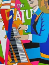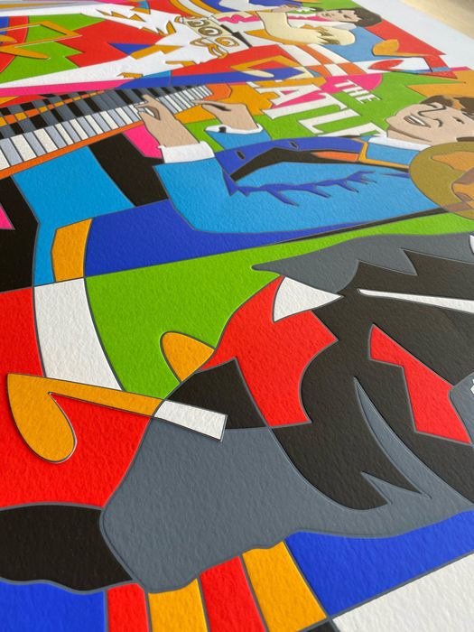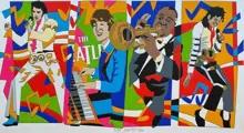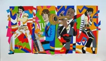 Zeefdruk van meester Ugo Nespolo, waar hij de vier mythen van de muziek vertegenwoordigt: