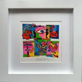 Totale afmeting 57X57,cm ingelijst met handgemaakte witgelakte lijst. Live kunt u alle handmatige ingrepen op de zeefdruk waarnemen die de foto niet halen.