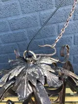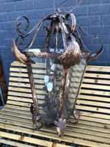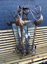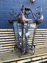 Lamp is ook voorzien van een zware ophang ketting met stevige ophanghaken. Mooi sierlijk smeedwerk voorzien van geslepen oud glas.