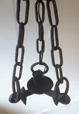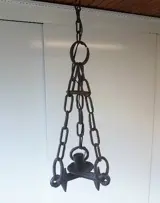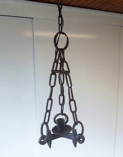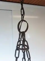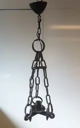 Hanglamp met 1 fitting.Gemaakt van een ouderwetse eg, bevestigd met kettingen en ringen om zo op te hangen. Hoogte lamp: 71 cm.Vraagprijs: € 50,-