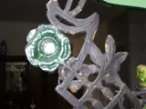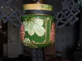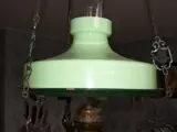 Puntgave antieke olielamp met groene kap en bloemen motief in prima staat.