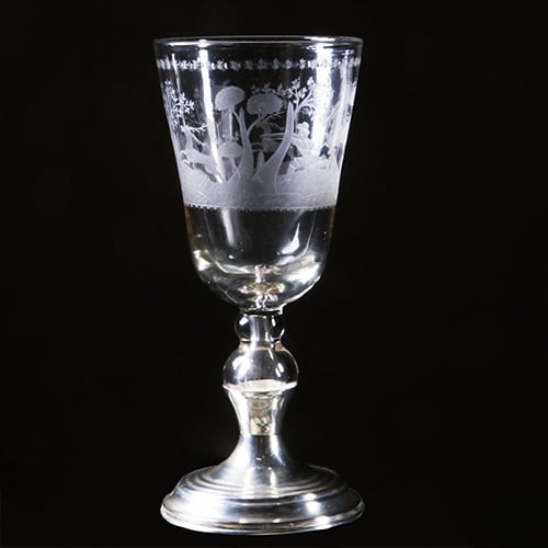 18e eeuwse gelegenheidsglas of bokaal met jachttafereel rond een kasteel op 19e eeuwse zilveren voet