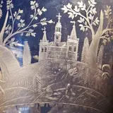 Wie dit grote gelegenheidsglas, dat rijk versierd is met een schijnbaar eindeloos doorlopende voorstelling, ter hand neemt kan verdwalen in een tafereel met een prachtig kasteel, jagers te paard en te voet, jachthonden en afwisselende bosschages.