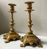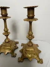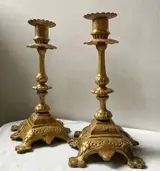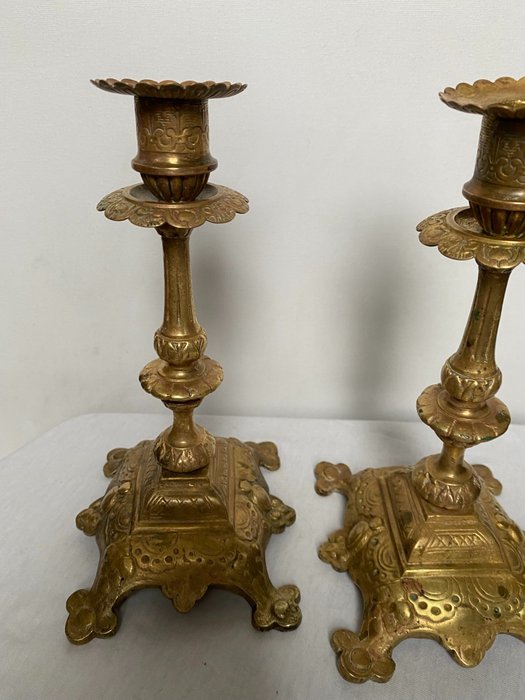 Twee antieke, prachtig versierde en elegante massief messing kandelaars met barokke stijlelementen.