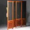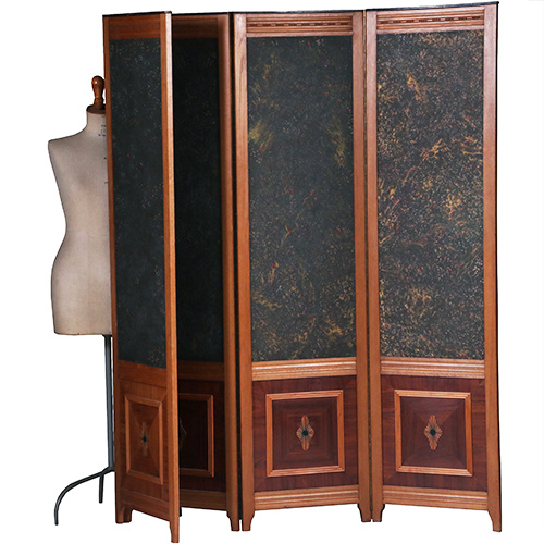 Hollands Amsterdamse school 4-slags kamerscherm. Het scherm is aan voor en achterzijde even belangrijk afgewerkt. In de onderzijde 4 fraai ingelegde panelen met een mahonie kader, een blonde lijst daarin een rozetje met een ebbenhouten cirkeltje.