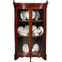 Antieke kast / Kwartronde hoekkast in mahonie ca. 1890 met gebogen ruiten Een vitrine die aan de binnenkant net zo mooie is als aan de buitenkant... Massief Cubamahonie kwart ronde hoekkast met gebogen glas, drie schappen achter de deuren, elk schap met een kleine verdiept profieltje waarin borden rechtop gezet kunnen worden. De zijstijlen geflankeerd door ranke gedraaide kolommen die eindigen in een blokpoot waarop de kast staat. Een kleine gedraaide poot in het midden en op het bovenblad links ...