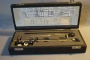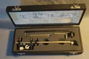 Allbrit planimeter, serienummer 9968, is het verstelbare type met een reeks metrische schalen in een met kunstleer beklede houten kist. Het werd vervaardigd rond 1949. Met het vergrootglas dat kan worden gedraaid om ofwel de schaalinstelling nonius of de meet nonius af te lezen. Kalibratiegegevens worden vastgelegd op het papier aan de binnenkant van het deksel. Ik weet niet zeker hoe het werkt en gebieden moeten worden gemeten, maar alle onderdelen lijken in de doos te zitten. Traceerarm 23,5 cm lang, ankerarm 20,5 cm, de afmetingen van de doos 28 x 11 x 5,5 cm