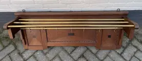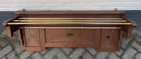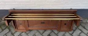 Fraaie eikenhouten Amsterdamse School kapstok met coromandel elementen en zeven messing kapstokhaken. Op de messing roedes kunt u hoeden plaatsen.